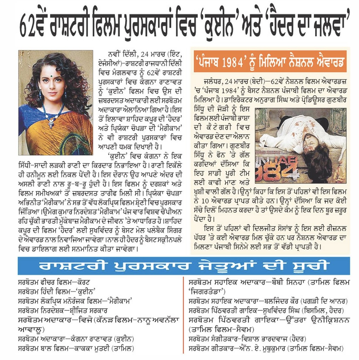 Winning big at the National Film Awards, Punjab 1984 was honored as Best Punjabi Film for its emotional, terrorism-era story starring Diljit Dosanjh.